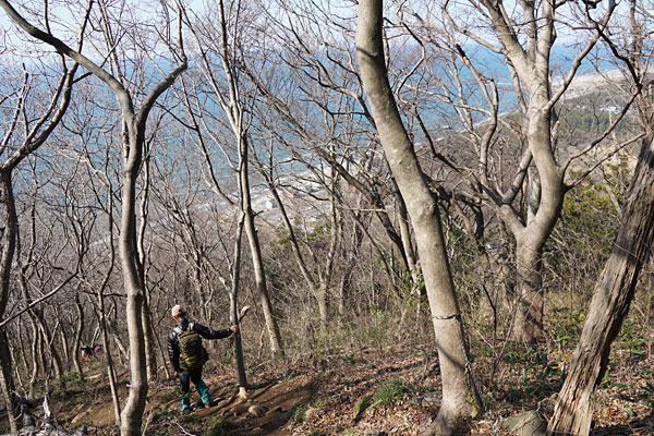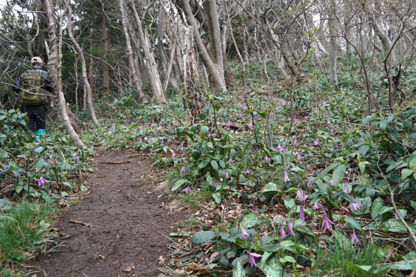 五ケ峠、灯台コース方向へ向かう木道横の林には雪が残っていました