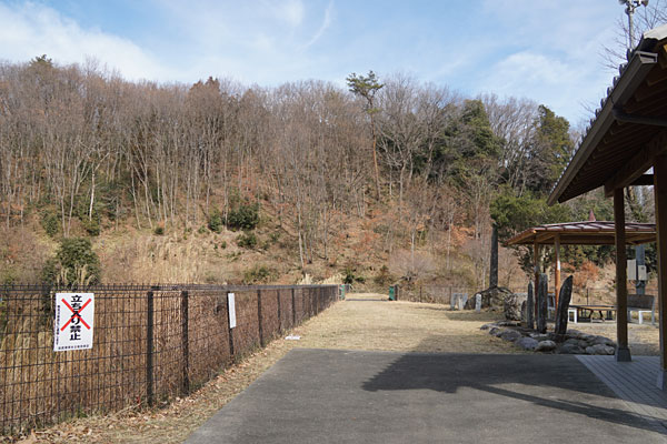 ベンチの先に「登山道緊急時ポイント 八幡山①」の標識があって