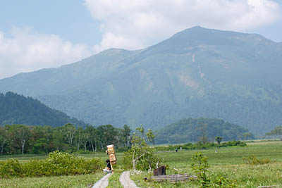 | 至仏山登山の解禁に合わせて、7月初め、4人て燧ケ岳に登った。一日目、同行の二人が鳩待峠から至仏山へ登るということでお昼に竜宮小屋で待ち合わせをした。私たちは二人は竜宮小屋までコースタイム2時間15分のところを6時間たっぷり時間を費やし、抜けるような青空の下、のんびり尾瀬ケ原を散策した。 |