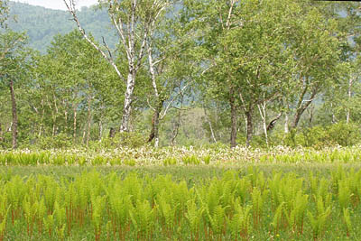 | あっ!これ。中田代周辺に生えていると本に書いてあったヤマドリゼンマイだ。やわらかな緑色が白樺に映えて、まるで水彩画のような景色を醸し出していた。 |