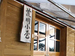 百間洞山の家着 12:12。 目の前には川が流れ、花々が咲いており、小屋は新しくきれいで気持ちがいい。