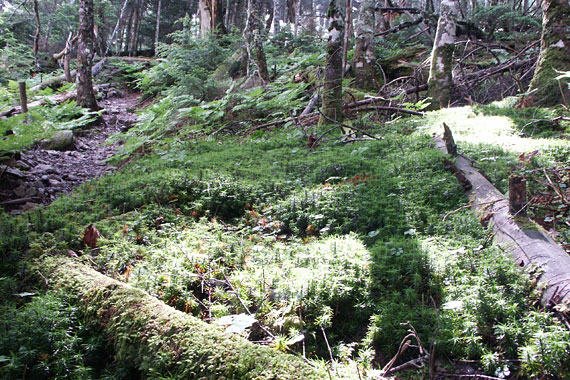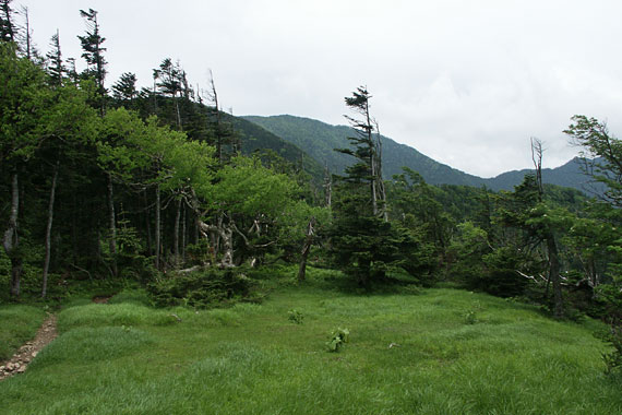 三吉平へ向かう。シダの緑とバイケイソウの緑が鮮やかな登山道を行く