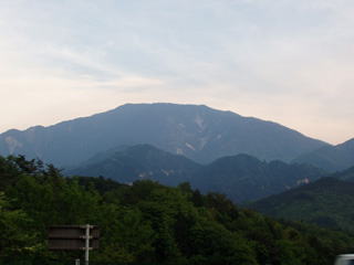 | 5/20(金)荒島岳登山口そばの民宿に向かう途中で越前大野の町から荒島岳を望む。 |