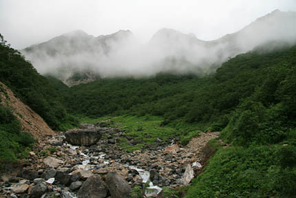上高地を歩きだす時は止んでいた雨が徳沢に着くころには大粒の雨が降ってきた。キャンプ場の屋根がある炊事場でレインスーツを着る。こんなはずではなかった。<`〜´> 雨は、その後も降ったり止んだり。 槍沢ロッジに10:50着。小屋でひと休み。おにぎりを食べながらこの後、南岳山荘まで頑張って登って行こうか?迷っていた。まだ時間は早い!でも、最後の岩場で降られたら?この空模様では天狗原から槍ヶ岳は望めない。それだったら急ぐことはないかな。明日からの天気に希望をつないで、今日はこのまま槍沢小屋に泊まることにした。 荷物を整理しゆっくりしていると大きな雨音がしてきた。外を見ると激しい雨になっていた。登っていたら今ごろは横尾尾根の岩場あたり、登らず小屋逗留で良かった。