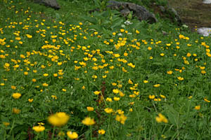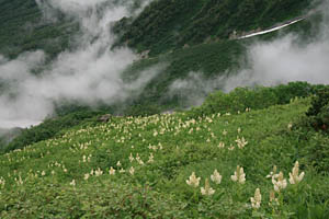 見えていた槍の穂先も山荘に向かって登っているうちに,雲が垂れこめ、見えなくなってしまった。その上、雨も落ちてきた。仕方がなく、小屋の前で雨が止むの待っていた。そのうち小止みになってきたので、「登っても何も見えないね」と言いながら山頂を目指した。