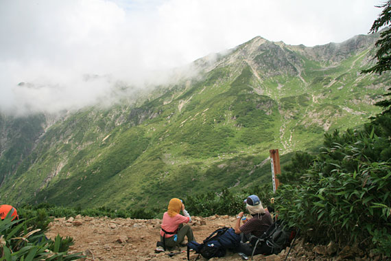 ガスの切れ間に笠ヶ岳が姿を見せた。笠ヶ岳まではまだまだ遠い