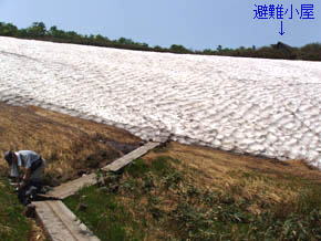雪渓を横切り避難小屋へ この日は真夏並みの気温。雪渓の上は涼風さわやかで心地よかった |