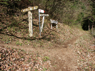 スミレ咲く、山あいののどかな飯尾の集落を見下ろしながら歩いていくと、ほどなく、分岐に到着。 ツツジが多いコース の標識に従い、右手の西コースをとります。