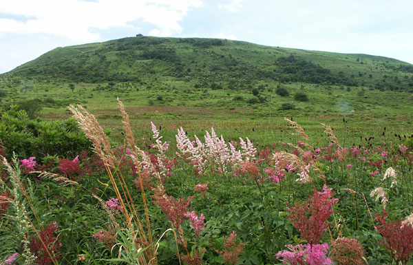 アカバナシモツケソウのお花畑が広がっている。鮮やかな赤色だ。風に揺れるチダケサシ。