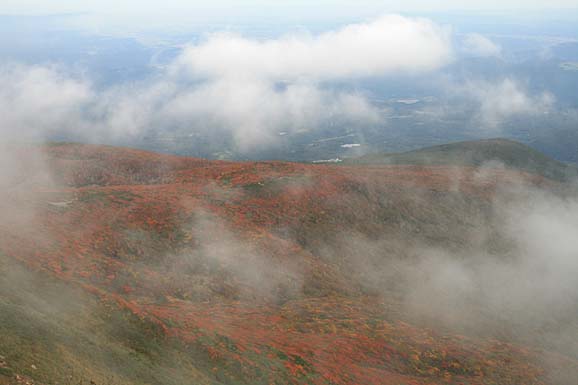 昨日歩いたいわかがみ平からの東栗駒山コース、中央コースを望むと一面、錦の絨毯を敷いたようです。陽が西に傾き、雲もでてきて、光が足りないのが残念ですが、それでも絶景でした。