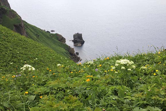 遊歩道から見た桃岩とお花畑・黄色のセンダイハギとセリ科の花