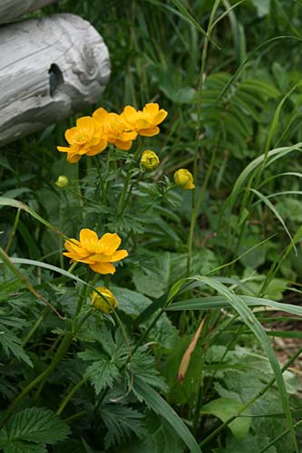 桃岩展望台手前の草原でレブンキンバイソウを見つけ、逆光なのに花の写真を撮るのに夢中。きっと、まだ先にもきっと咲いているはずなのに・・・。先を急がなくちゃ!