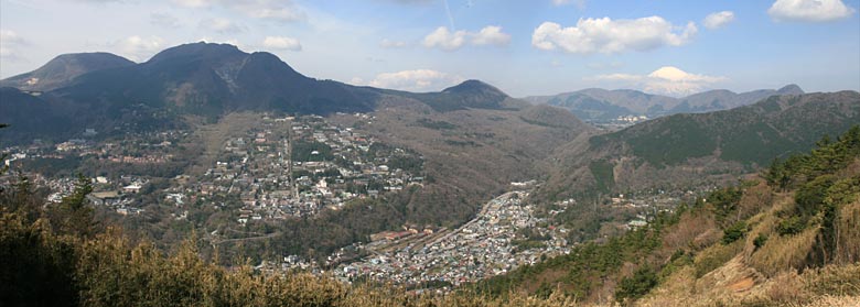 正面に強羅の町並みと大涌谷、駒ケ岳。右に富士山と金時山。