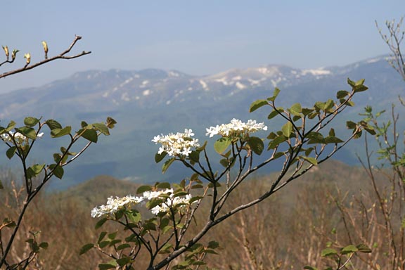 オオカメノキも白い花を咲かせています。奥に見える残雪の山は草津白根山でしょうか?