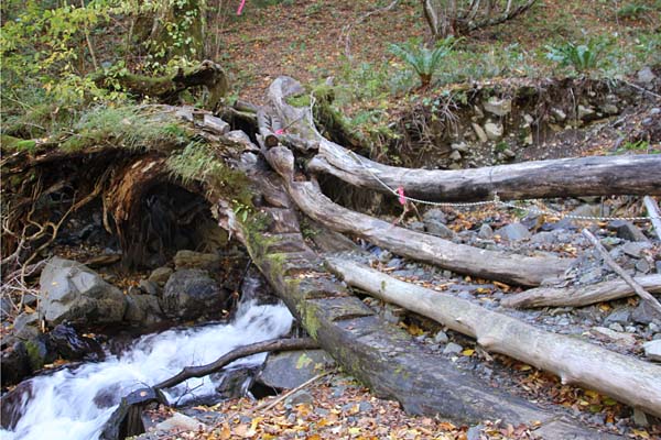 小さな沢にかかった朽ちかけた橋。流れがないので橋の下を歩きます。