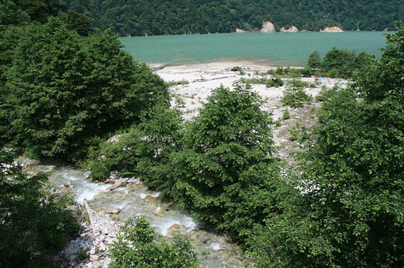 二つの隧道を抜けると色濃い緑白色した湖面が広がる湖畔の道となる。