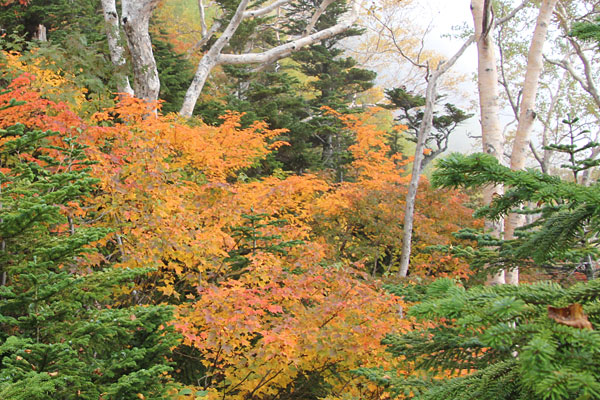 秋真っ盛り。山肌を錦に染めるのはダケカンバの黄色、ミズナラやヤマウルシの赤い葉っぱたち