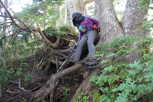 こんどは、根っこがむき出しの登山道、ロープが張ってあります。