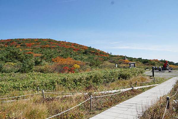 反対に山頂方向を見上げると紅葉の山肌に枯れ木が?まるで縞枯山みたい
