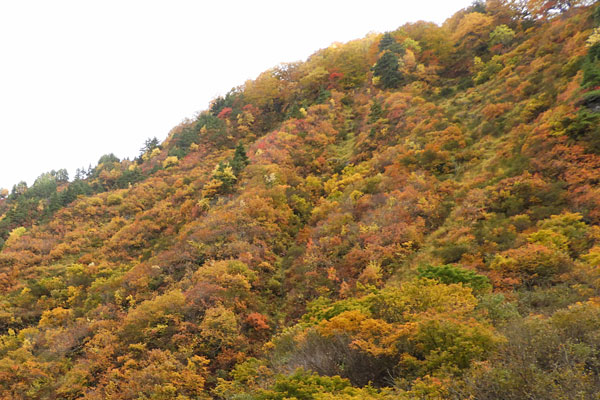 早朝で日差しがないけれど、左手側斜面の紅葉がとてもきれい!