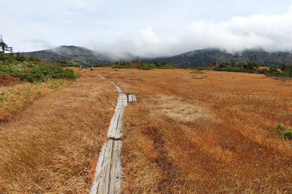 急坂を登り切ると上毛無岱。まっすぐ延びた木道を歩いて行きます