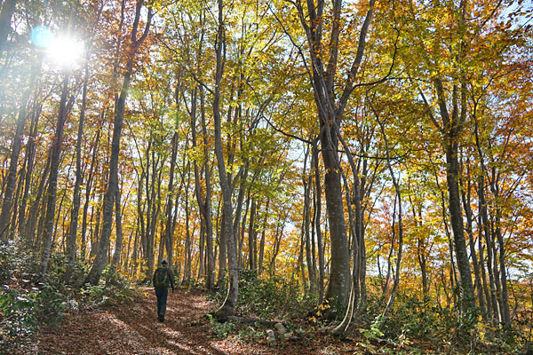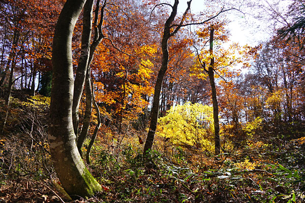 振り返ると青空に橙色のブナと黄色のミネカエデが映えています