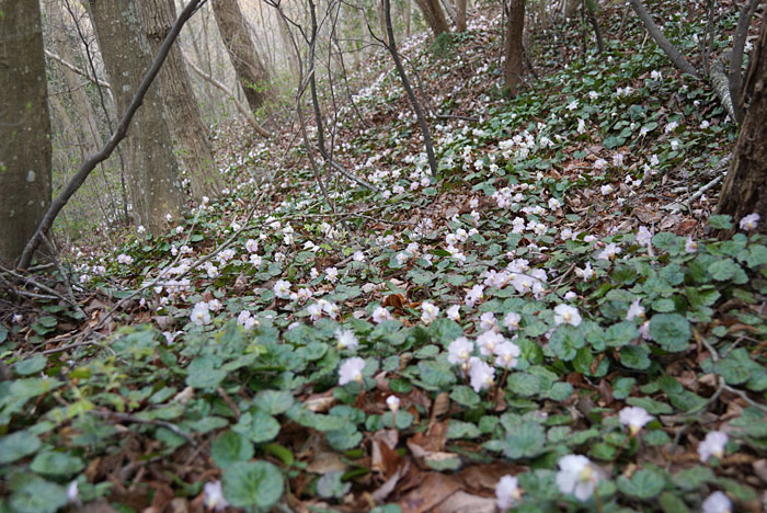 植林の林の中でパッと目を引く紫色のミツバツツジ