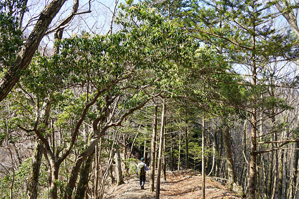 木の間から精進湖を眺めながら緩やかな道を進むと