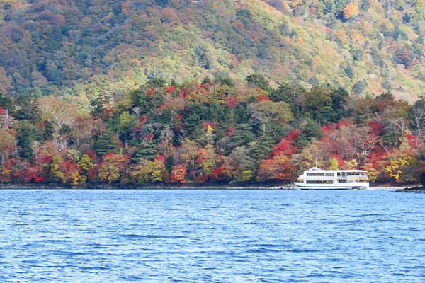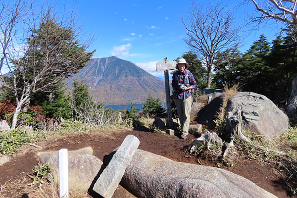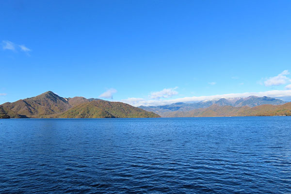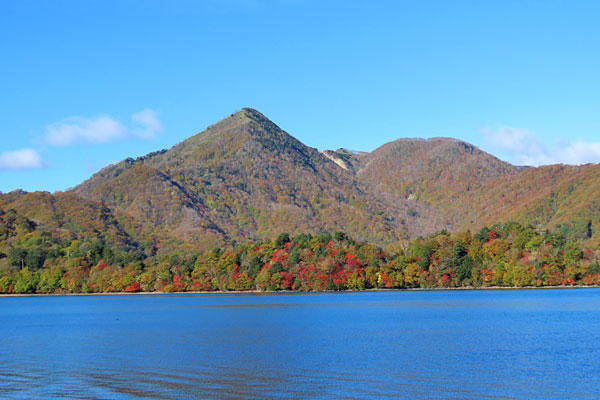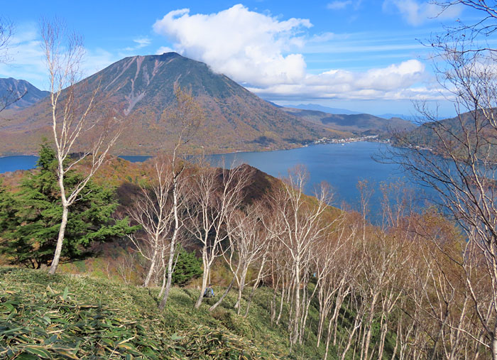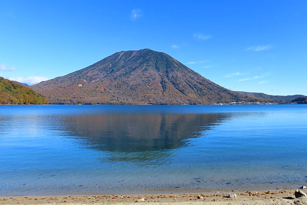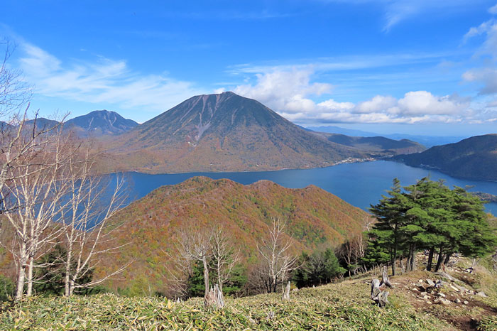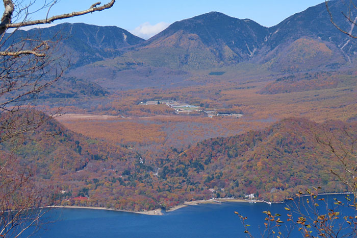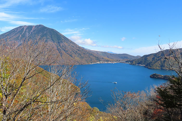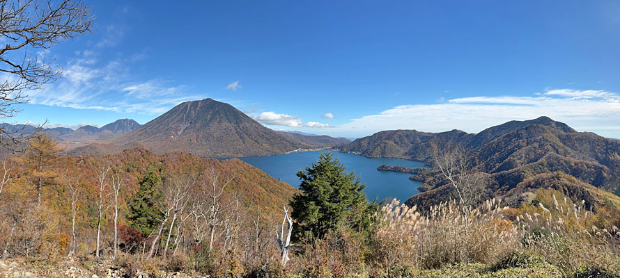 男体山の左に太郎山と山王帽子山 中禅寺湖の右に半月山と八丁出島