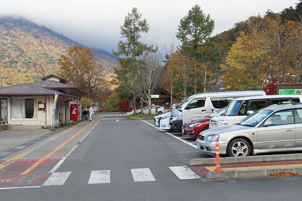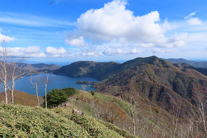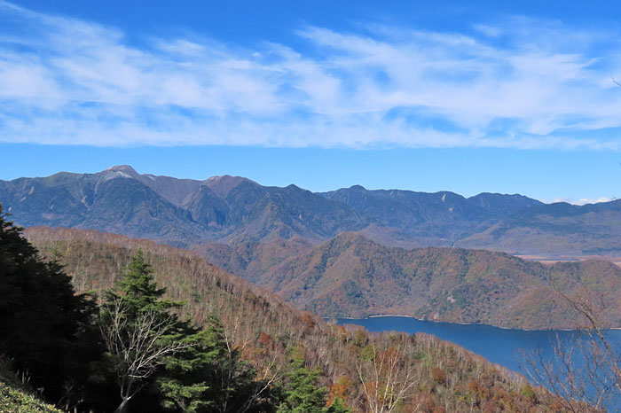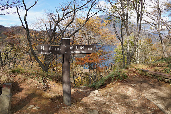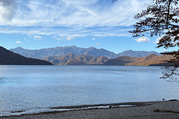 湖畔から目指す社山と日光白根山を眺め歩き出します