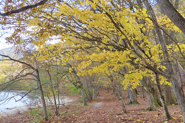 明るく透明な黄色い葉っぱが湖畔沿いのあちこちで輝きを放っていました