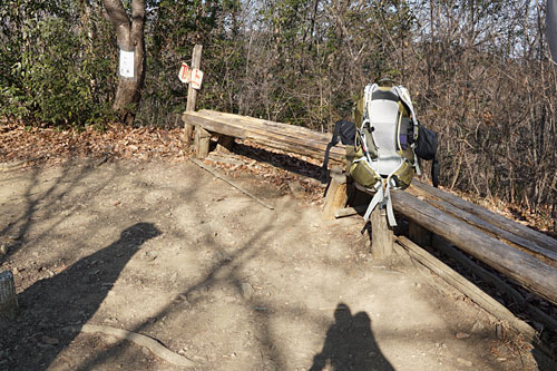 ベンチの先に「登山道緊急時ポイント 八幡山①」の標識があって