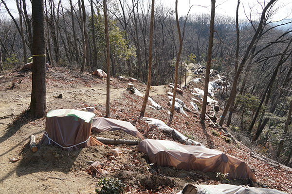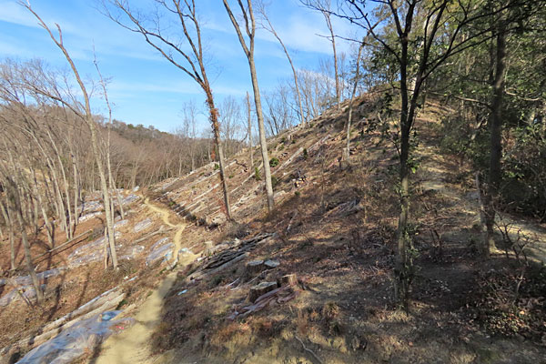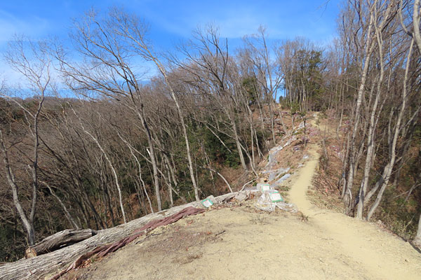 左は伐採地を通る巻道 右は198m三角点に登る道