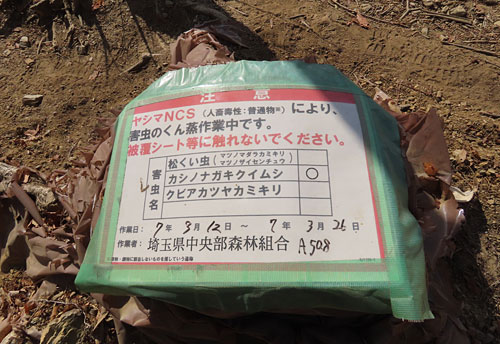 「害虫のくん蒸作業中です。被覆シート等に触れないでください」と注意表示が!