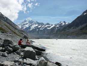 NZ最高峰・マウントクック(標高3,764m)を正面に望む展望台、シアリーターンズへのハイキングの予定でしたが、この日は風が強く危険が伴うということでフッカーバレー・トラックをハイキングしました。 |